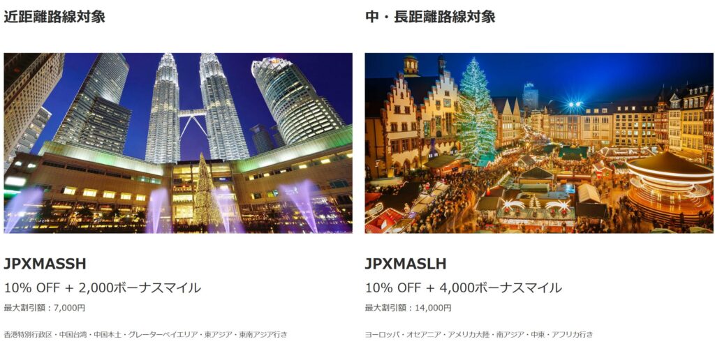 ヨーロッパや北米など中・長距離路線用クーポンコード「 JPXMASLH 」