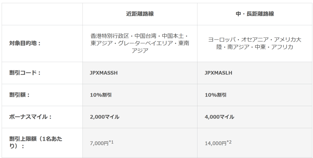 東南アジアなど近距離路線用クーポンコード 「 JPXMASSH 」