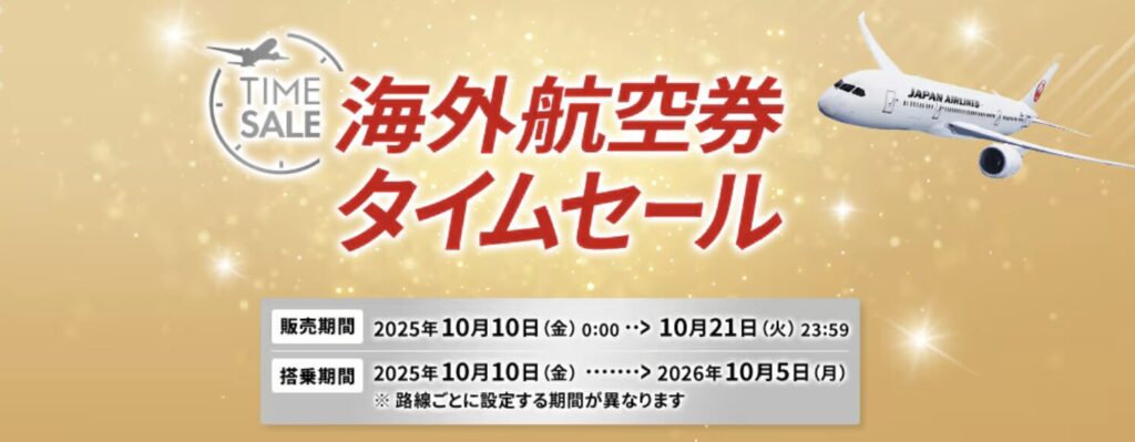 JAL(日本航空)では、2025年10月10日(金) 0:00~10月21日(火)23:59まで国際線航空券のタイムセールを実施中です。セール期間中は通常よりもかなりリーズナブルに航空券を購入できるので、この機会にぜひ航空券の価格を確認してみてください